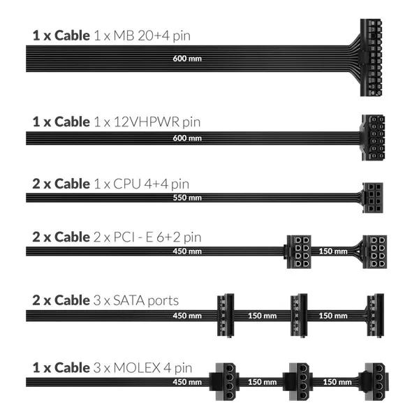 Csomagolás tartalma: Tápegység, 1,5m tápkábel, kábelek, 12VHPWR kábel