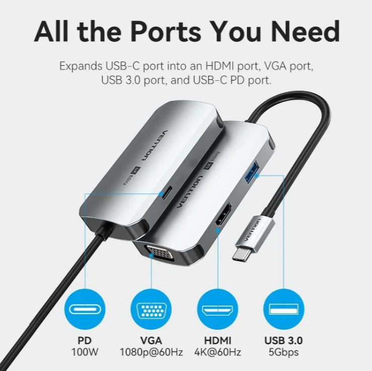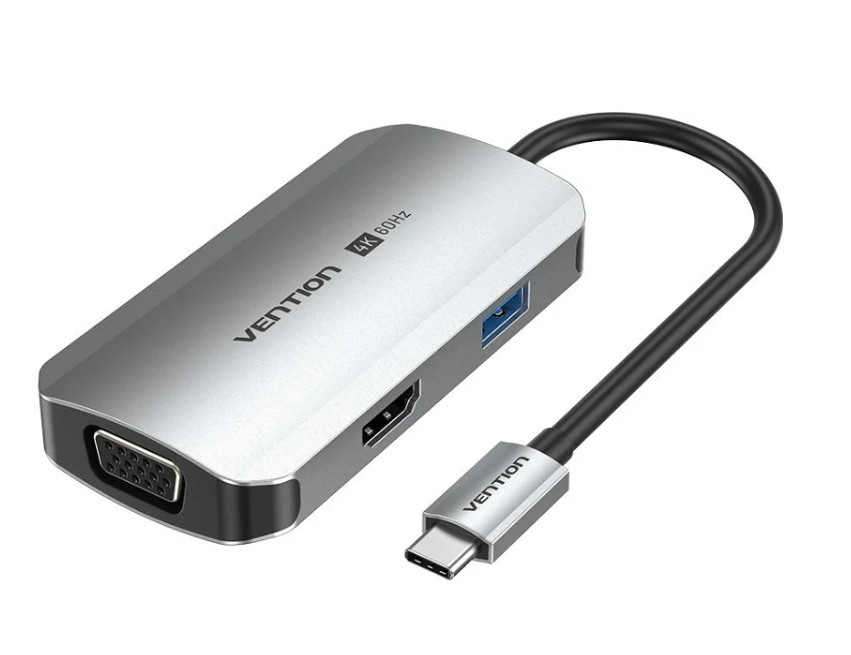 Vention USB-C -> HDMI/VGA/USB 3.0/PD (0,15m Szürke Aluminum Ötvözet) Dokkoló