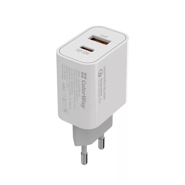 The Colorway Power Delivery Port PPS USB charger (Type-C PD + USB QC3.0) (30W) is a powerful adapter that is equipped with two USB and PD ports, which will allow you to charge 2 devices at the same time. The charger supports the latest fast charging technology Xiaomi turbo charge 27W, Apple fast charge, Huawei FCP, Quick Charge 2.0 & 3.0, Samsung SFC/AFC with an output power of up to 30 W. It is suitable both for fast charging of mobile devices and for charging devices in the usual mode. The intelligent USB Auto ID microcircuit determines the type of connected device, regulates voltage and current up to 3A, ensuring fast charging and high compatibility with devices of most brands. The charger is equipped with an intelligent chip to protect your devices from short circuit, overvoltage, overheating and overcurrent. The fire-resistant ABS case will NOT overheat when charging, ensuring excellent performance regardless of scratches, shocks or drops. Protect yourself and your equipment from the inside.