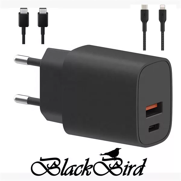 BLACKBIRD Hálózati Adapter T131 25W + Type-C + Lightning kábel 1m, Fekete